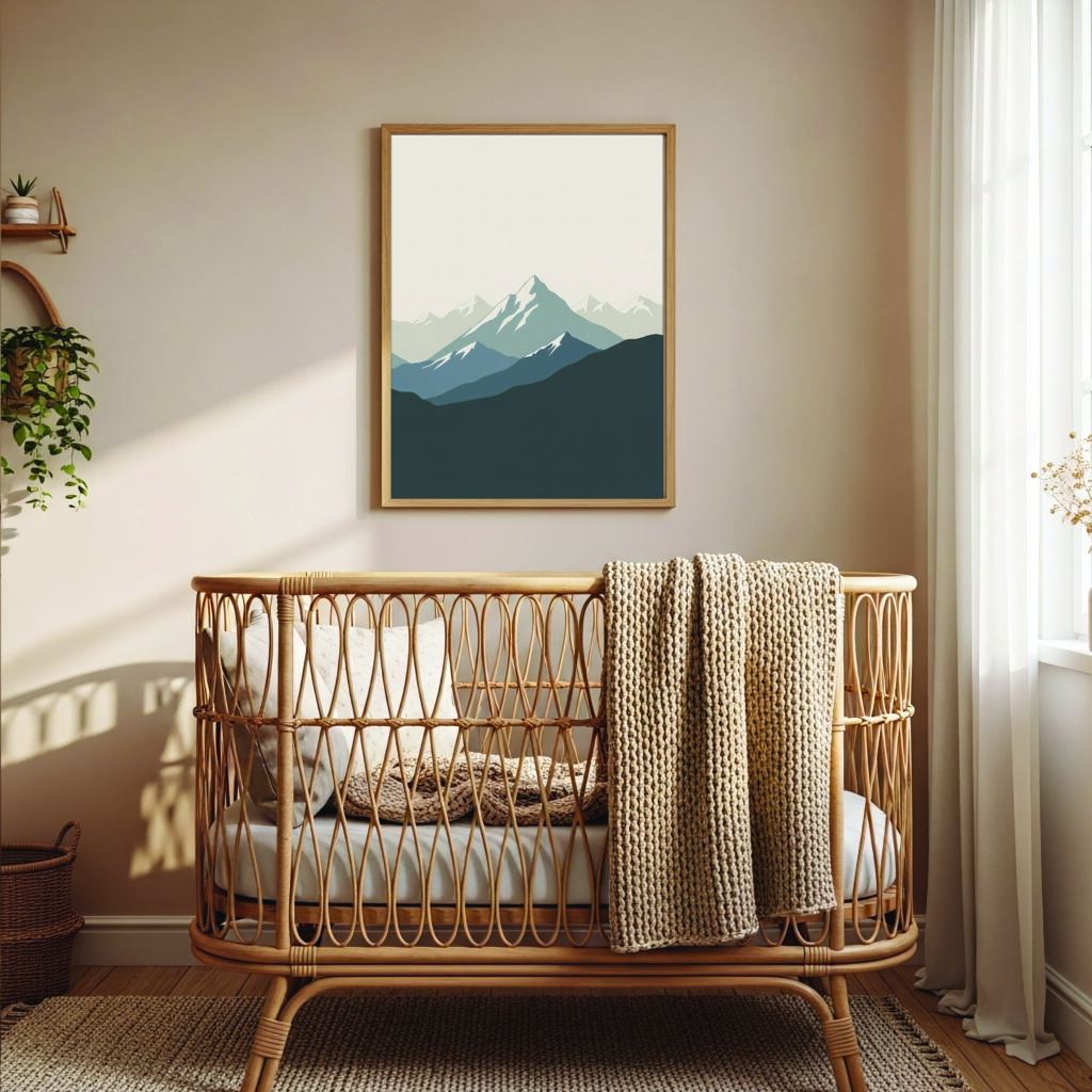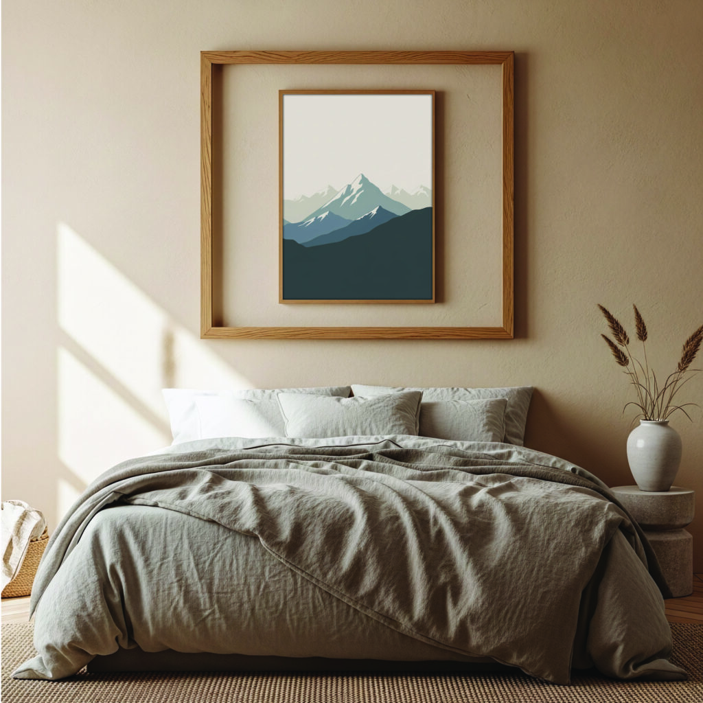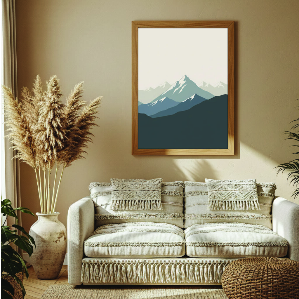 Featuring layered peaks in soft earthy gradients, this artwork blends boho warmth with minimalist simplicity. The clean shapes and gentle tones make it ideal for living rooms, offices, or calm reading spaces. Includes 6 HQ JPG files for flexible printing.